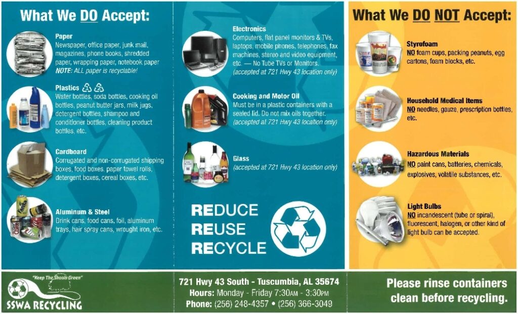 Here is a handout you can print at home! It has information about what and what not to recycle as well as where to find us.